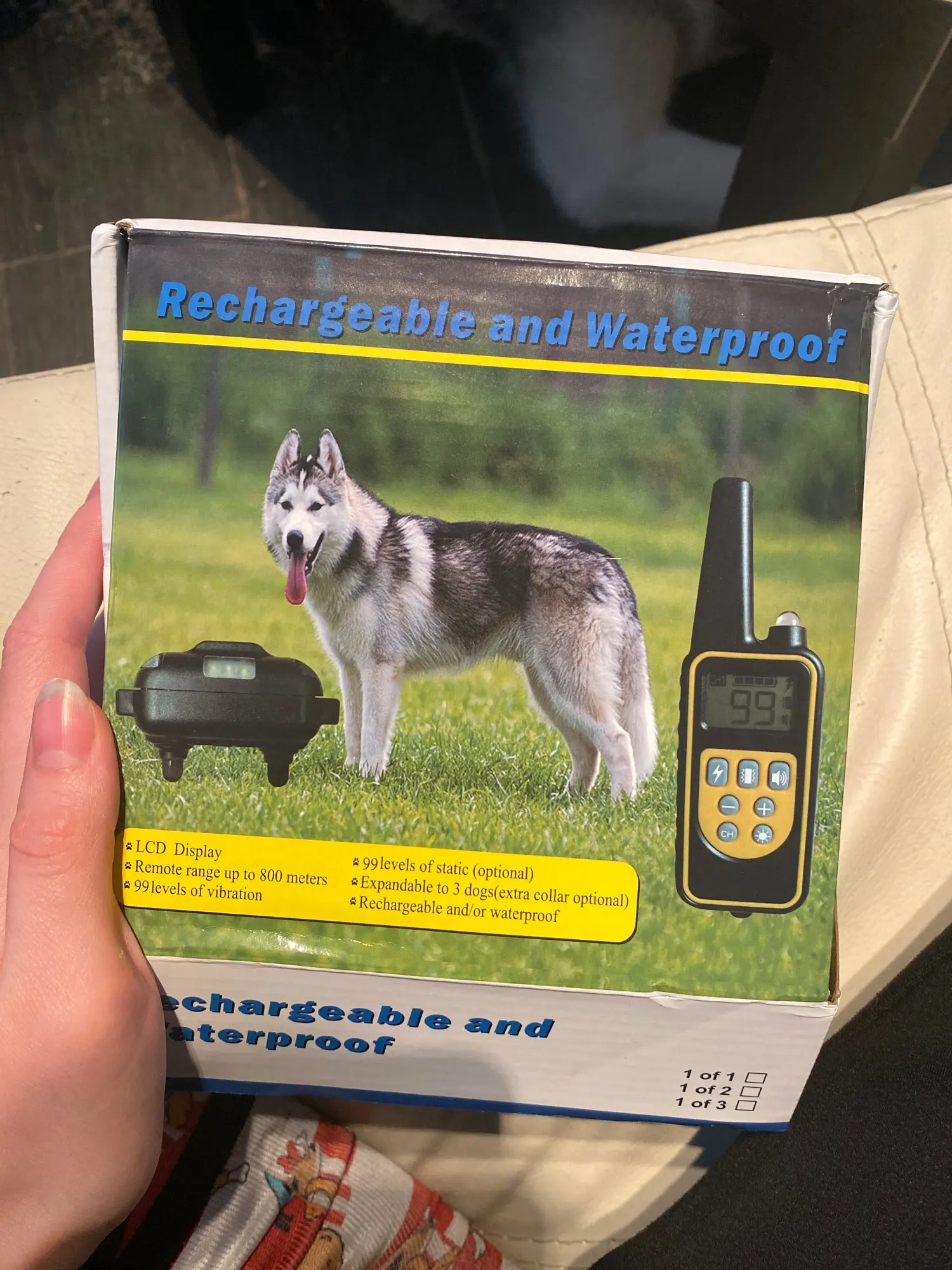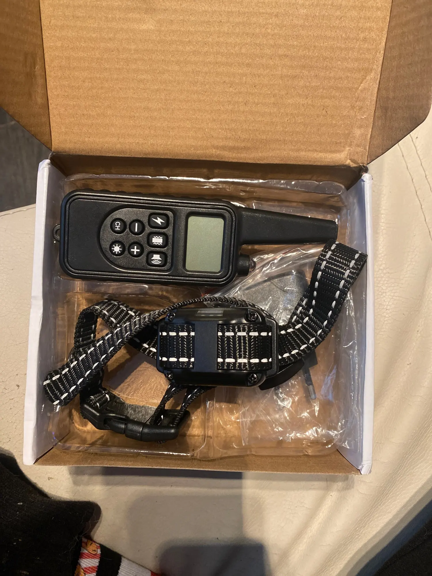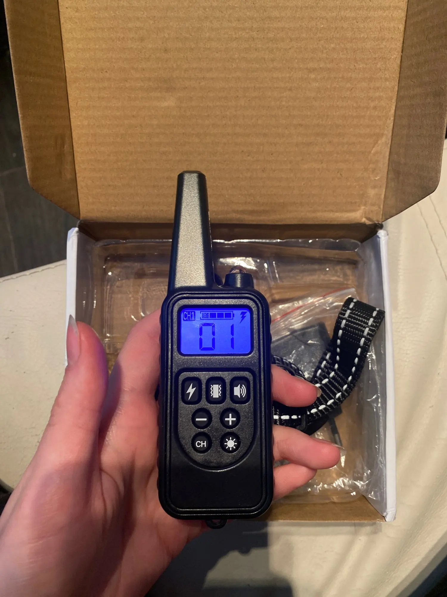 In your box with cable and charger. Good device to correct my dog’s faults. He’s not aggressive with the animal and you can graduate the intensity.